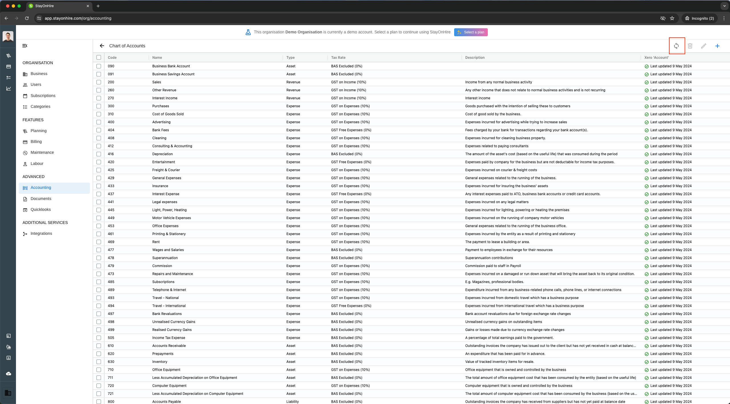 If you've recently added a new account in Xero and would like to see it in your StayOnHire account, click the sync icon on the top right-hand side of the page: