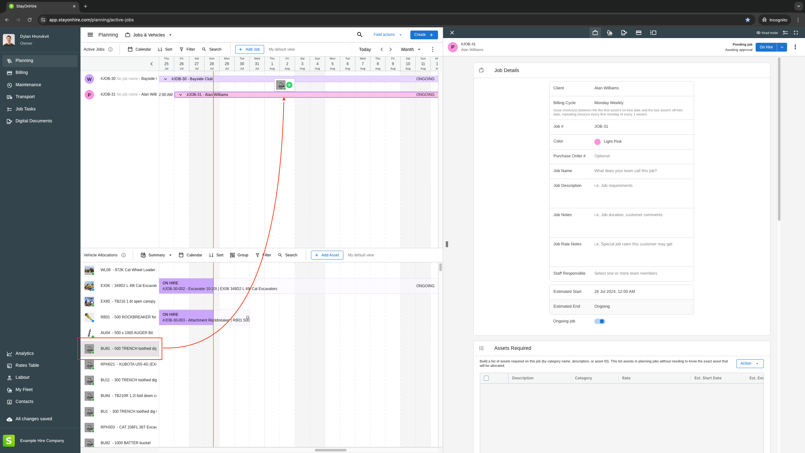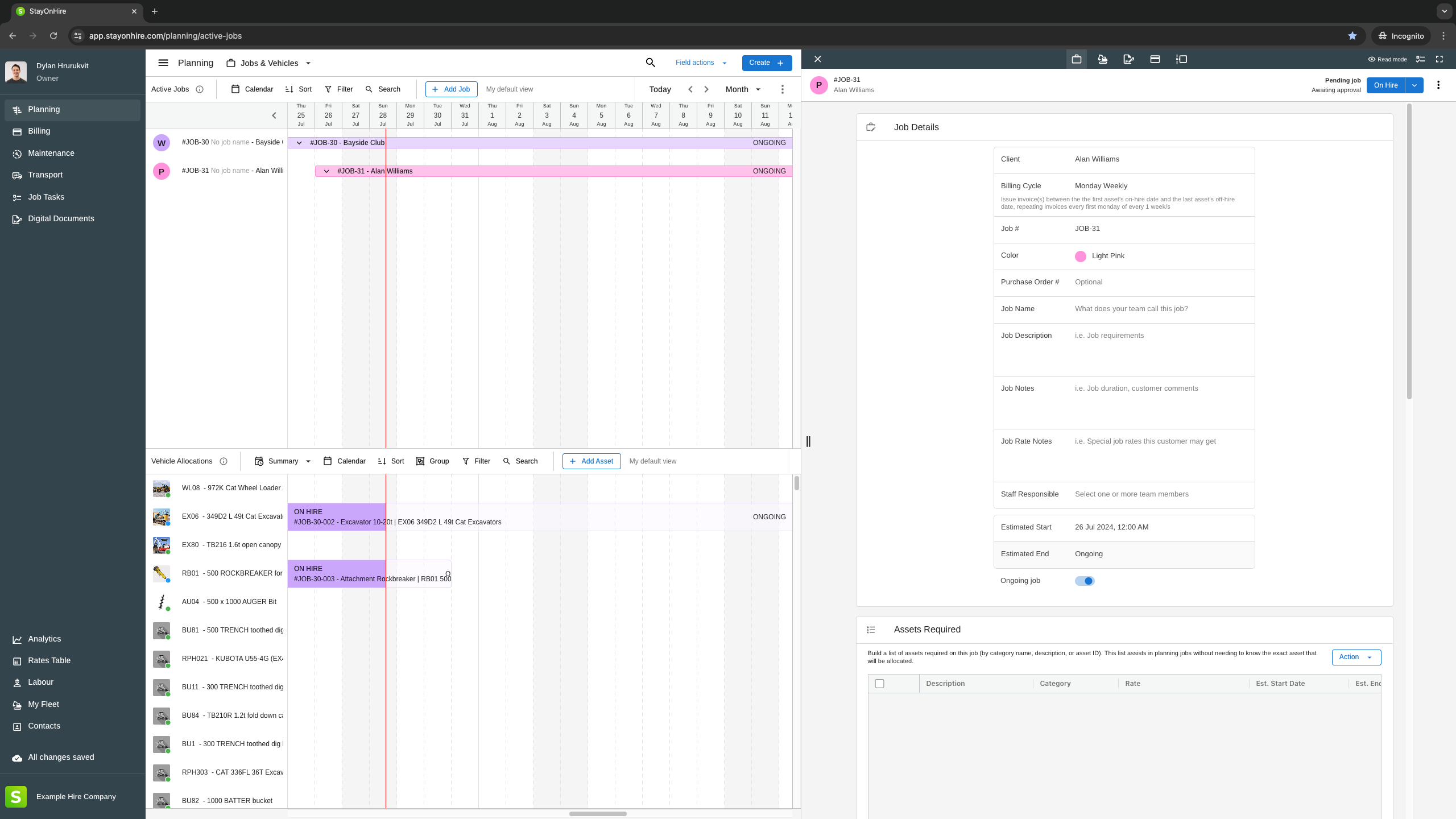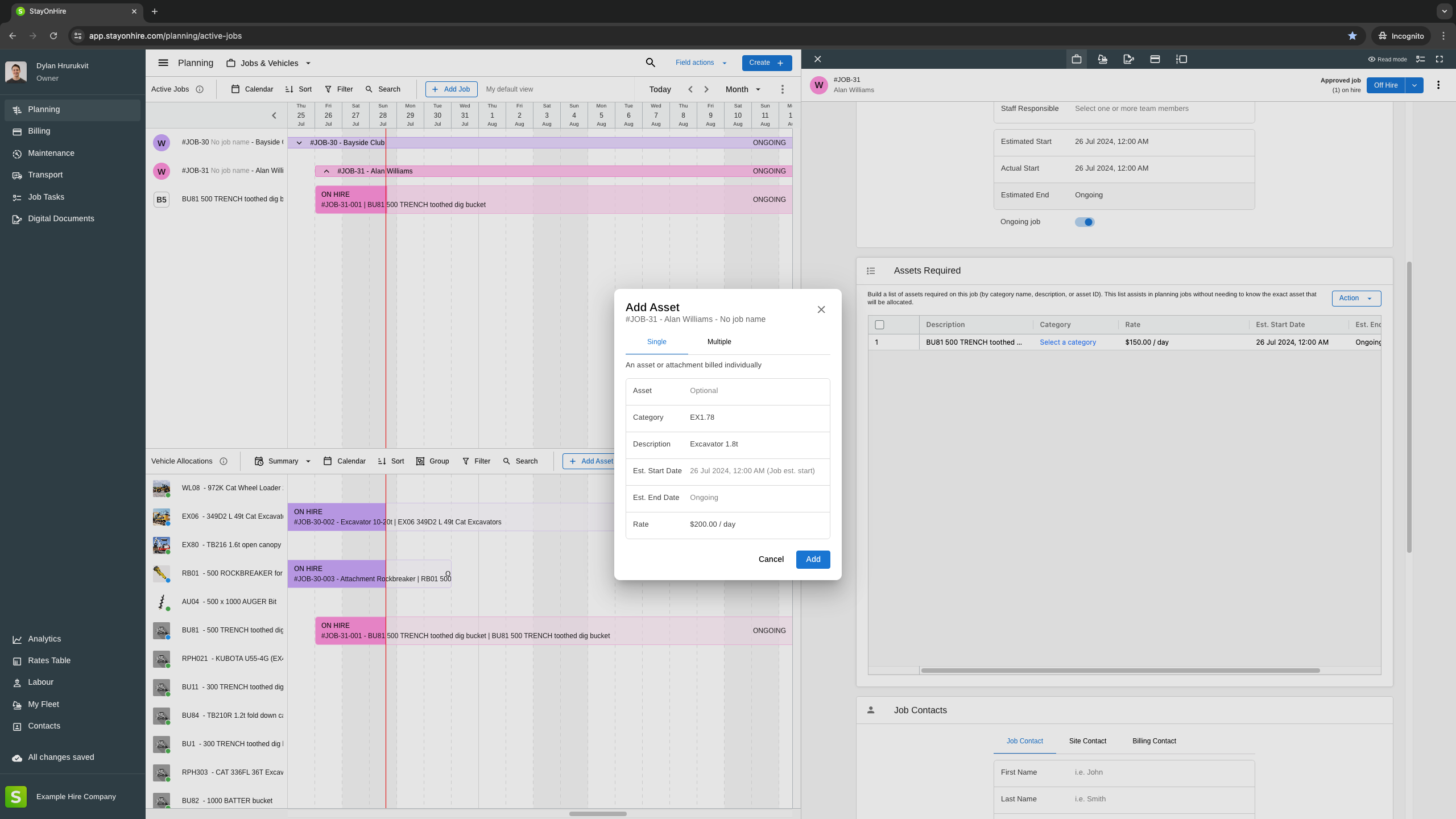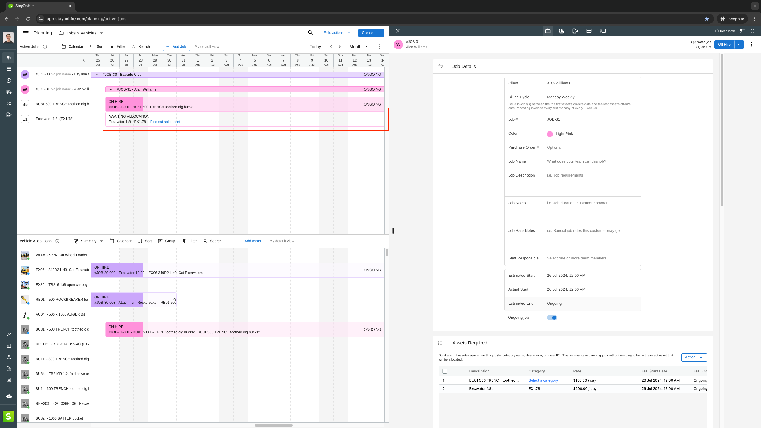 2. The asset will then appear allocated to a job, both in the 'Assets Required' table and in the asset allocation tab.
